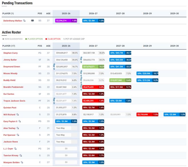 一旦完成了小库里的签约,那么勇士队就可以完成15+3名单: