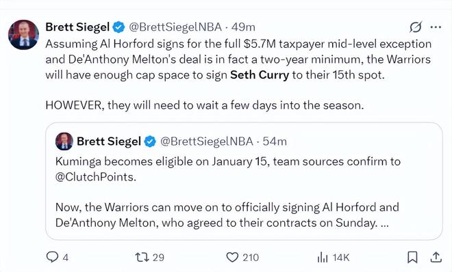 NBA记者Brett Siegel也分析了勇士队之所以可以继续签下小库里的关键,库明加起薪2250万,勇士队可以在第二土豪线以下签到霍福德、梅尔顿,而小库里能在11月15日后签约(没想到立马就签约了)。