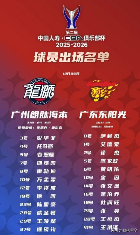 此外,广东男篮也在阵容名单做出调整,黄明依替代了张皓嘉,后者上一场比赛6中1得到4分4犯规,空篮不中和离谱的失误遭到球迷吐槽。